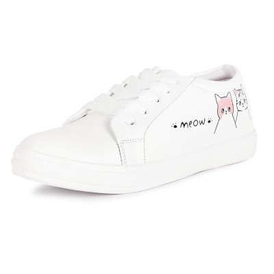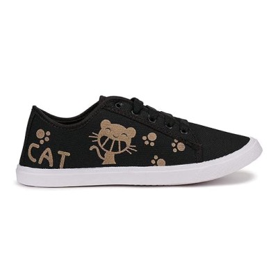 女式猫印花帆布运动鞋,黑色搭配金色设计,低帮,休闲