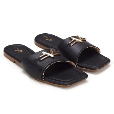 女式平底拖鞋金属链条细节 |柔软的PU鞋面 |防滑 PVC 鞋底 |舒适拖鞋链