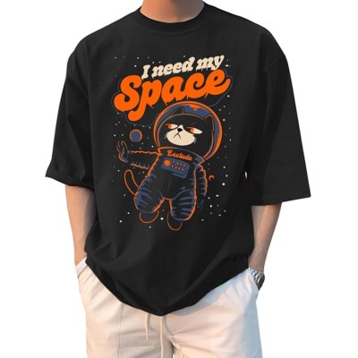 半袖超大号棉混纺圆领落肩印花男士T恤