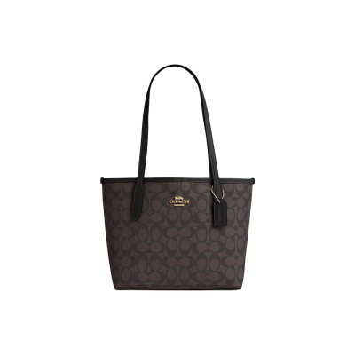 COACH蔻驰 City 23 经典老花金属徽标托特包Tote包购物袋单肩 涂层帆布拼皮革 手提包 中号 女款 胡桃木拼黑色